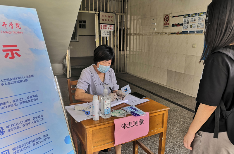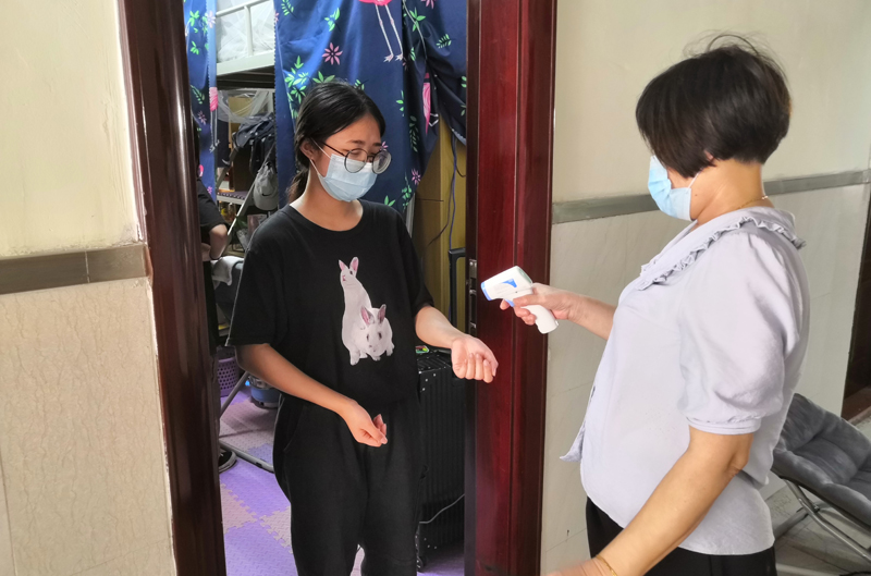 工作人员测量返宿学生体温