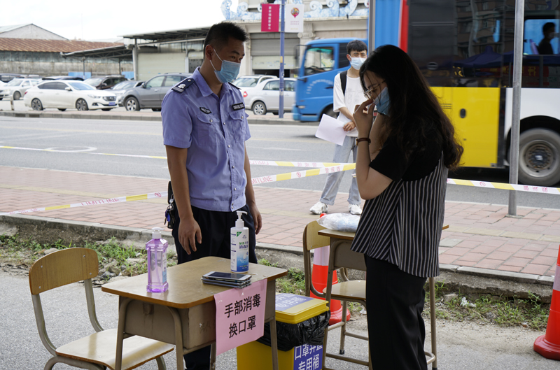 引导返校学生手部消毒、更换口罩