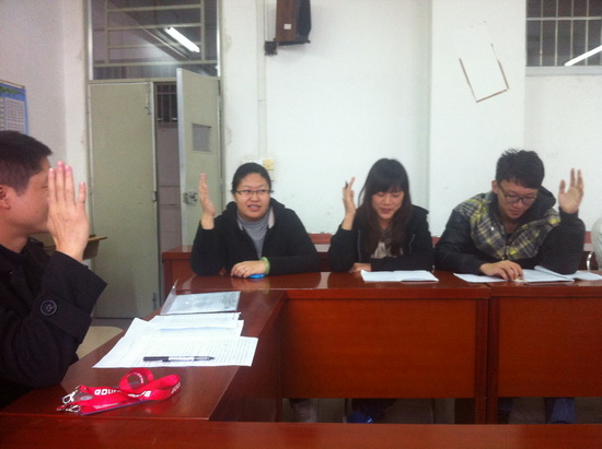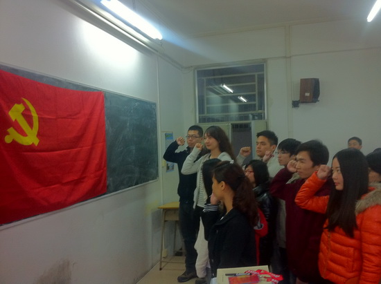 会议的主要议程是党员纳新仪式,杨晓婷等12名入党积极分子逐一宣读《入党志愿书》,并向大会汇报自己对党的认识、入党动机、表现等。申请入党的同学都真情的表达了对党的向往,对党的忠诚,表示坚定不移跟党走,为党的工作献出自己的力量,为共产主义事业奋斗终生。接着,入党积极分子依次表明他们要加入中国共产党的强烈愿望。邓强和辅导员李秋颖老师对发展的党员寄予希望,希望他们随时与党保持一致,为同学服务,做同学的表率,加强自我要求。然后,所有学生党员和预备党员也积极发表了对发展对象的看法并提出自己的意见,希望他们在今后能注意和改正不足,按照党员的标准严格要求自己。申请人再次标明态度后,拥有表决权的党员进行举手表决。最后,经过5名党员的讨论与投票,决定吸收杨晓婷等12位入党积极分子为预备党员。