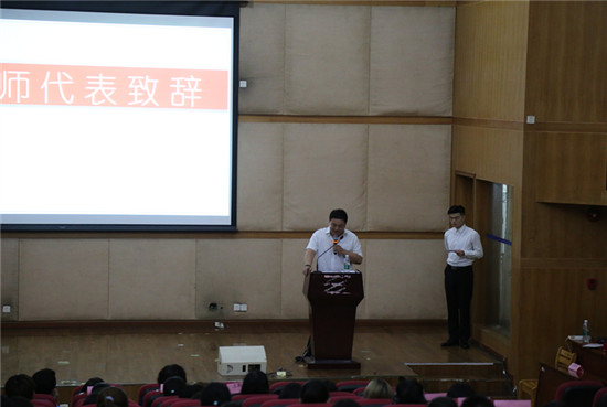 会议进行到第二项,由大学城分部优秀教职员工李思伊作为教师代表发言。李思伊先是从总体上表达了自己对于大学生活的见解与感悟,接着借助自己的亲身经历,为大家讲述了一个他在大学是如何从一开始落后于身边的人,到后来慢慢追赶甚至超越的励志故事,以现身说法为同学们阐明“勤能补拙”的至理。李老师语言诙谐幽默,当中又不乏哲理,给在场所有同学留下了深刻印象。