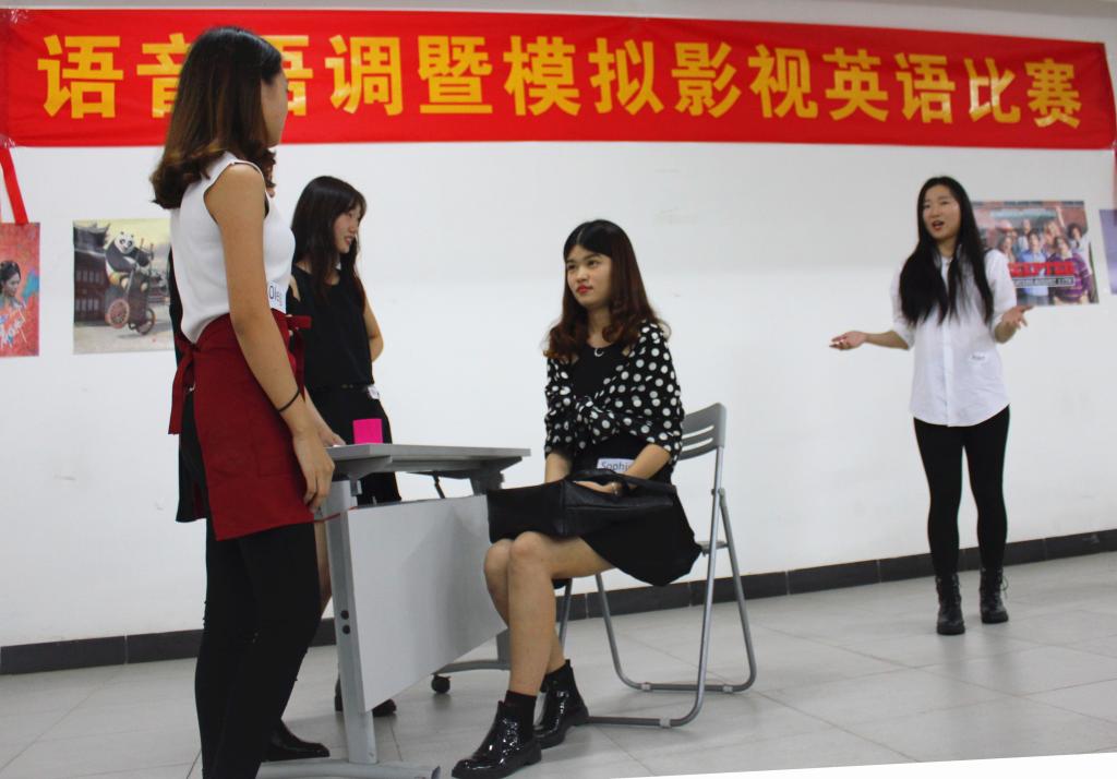第二部分:模拟影视英语小组展示。此环节通过模仿影视片段的形式开展。本次比赛,参赛队伍选取的影视片段来自:《录取通知书》、《破产姐妹》及《大话西游》。参赛队伍表演的各有特色,无不令人赞叹。其中,《破产姐妹》排演的十分精彩,选手们模仿影视中的人物惟妙惟肖,惹得观众捧腹大笑。