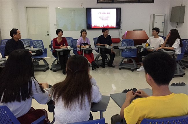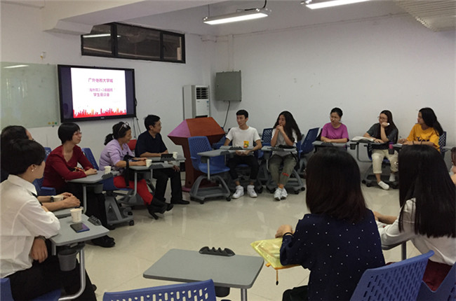 本网讯 11月15日,我院大学城分部举办了一场特别的学生座谈会——广外海外院2+2卓越班交流座谈会。参加此次座谈会人员有海南外国语职业学院处长张萍、主任刘榜离等领导、广外继教学院主任李梅庭、老师代表以及2018卓越班学生代表。