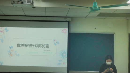 表彰仪式后,学生代表麦茜茜上台分享了个人体会。她认为缘分让舍友们相遇在同一屋檐下,生活于此,快乐于此,同学们来自不同的地方,生活习俗不同,大家应该彼此互相包容才能有利于和谐和共同成长,当前疫情防控已经常态化,同学们更应该同心协力,共同维护和保持好宿舍的卫生清洁。