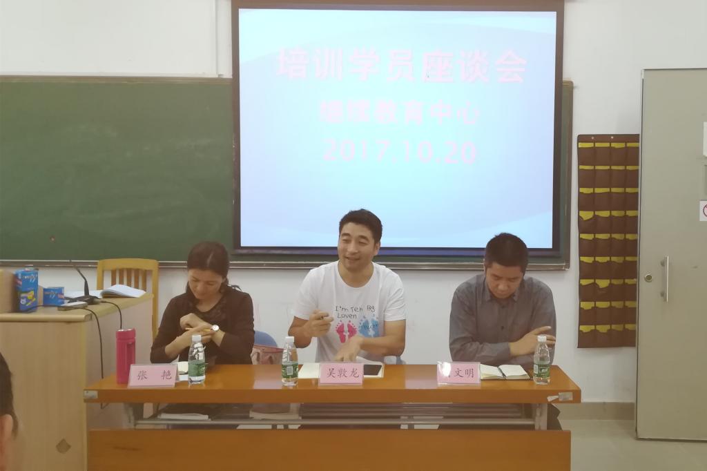 本网讯 10月20日下午,继续教育中心在三教124课室召开培训学员座谈会。目的是加强部门与学员的沟通,为学员解决实际问题,为下学期更好的做好学生服务和实践教学效果做良好的铺垫。继续教育中心主任吴敦龙、副主任刘文明、副主任巫盈、项目主任张艳出席了会议。会议由巫盈主持。