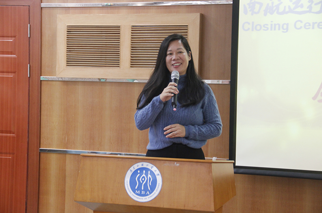 苏冬燕随后致辞。她首先对即将结业的25名学员表示衷心的祝贺,通过结业测试的成绩和刚才精彩的汇报演出,充分显示了学员们在英语听、说、读、写上的全面提升,真正实现了学员们学有所成,满载而归的初衷,希望学员们回到工作岗位之后能够学以致用,更好的助推南航国际化的进程。