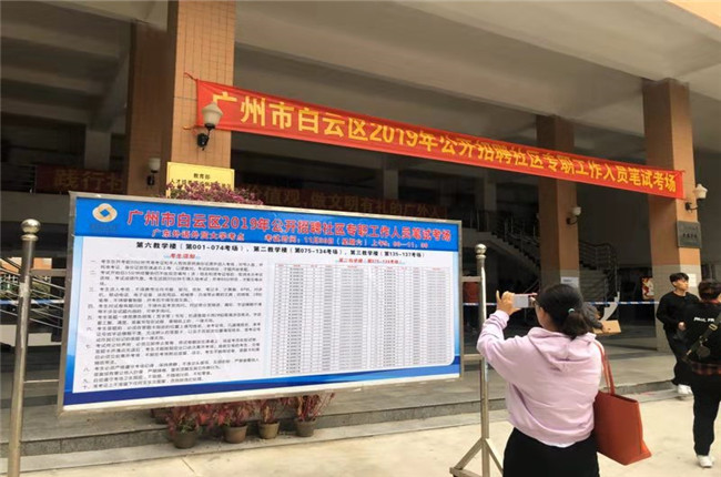 本网讯 11月30日上午,2019年广州市白云区社区专职人员招聘笔试在我校北校区举行。本次考试由我校高等继续教育学院与广东省白云人才发展有限公司共同承接,我校高等继续教育学院负责考试场地、考试布置考场与安保等后勤保障工作。白云区民政局领导、白云人才王军总经理在考试现场进行了巡考工作,我校高等继续教育学院李天明副院长、继续教育中心主任白丽云陪同。