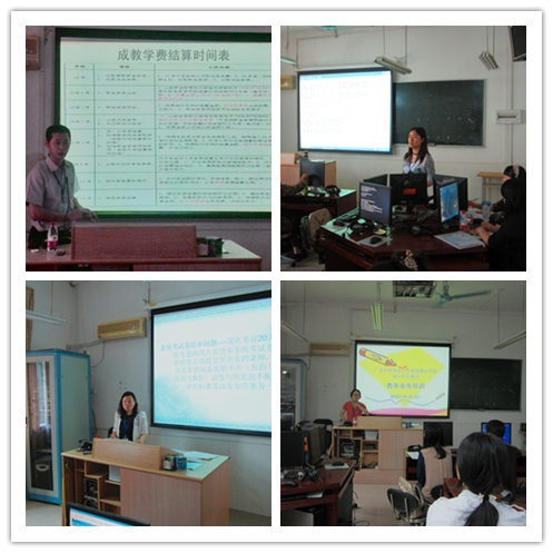 本次业务培训内容涉及日常管理各环节,除教务、学籍管理、学生管理、教学计划外,还增加了学费缴纳和结算等财务相关知识培训。2日上午,首先由学院财务部黄建霞作财务相关知识的培训,内容主要包括财务票据使用细则及财务管理规定等,同时就各校外教学点在学费和票据的上缴过程中存在的问题进行了分析和沟通,并再次明确了我校财务在开票和交票方面的各项具体要求,有效地解决了校外教学点在学费缴纳和票据使用等方面存在的问题。随后成教办尹维春针对成教学费结算等有关工作流程和出现的问题进行了培训、答疑。2日下午由成教办林碧静主讲学籍管理模块的培训内容,同时对各教学点在学籍管理过程中遇到的问题进行了交流。3日上午,成教办陈琳和刘川主讲教务管理模块培训内容,强调了各教学点教务管理过程中出现的规范性问题和成绩管理问题,尤其是开学初提交的《教学信息汇总》材料的细节性问题。针对各教学点的具体情况进行了逐一说明和答疑。