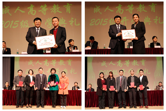 典礼随后进行表彰环节,任跃忠宣读了《关于成人高等教育校外教学点的表彰决定》《关于表彰成人高等教育校外教学点2014年度“先进管理工作者”的决定》,曾健文宣读了《关于表彰成人高等教育校外教学点2014年第二学期“优秀教师”的决定》。接着,何勇斌分别为获得“年度优秀管理奖一等奖”、“年度优秀管理奖二等奖”、“年度招生先进单位”和“年度优秀校外教学点”荣誉称号的教学点一一颁发牌匾并合影留念。任跃忠和曾建文则分别为获得“先进管理工作者”的教学点工作人员和获得“优秀教师一等奖”、“优秀教师二等奖”的教师一一颁发荣誉证书并合影留念。