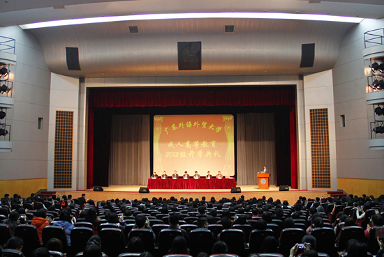 开学典礼伴着嘹亮的国歌声正式开始。首先是何勇斌致辞,他代表学校向分布在广东全省各个教学点的3700多名2015级成教新生表示热烈的欢迎和衷心的祝贺,并向新生全面介绍了广外以及继续教育(公开)学院的发展变化。他说,广外作为一所具有鲜明国际化特色的广东省重点高校和华南地区人才培养的重要基地,建校以来,践行“明德尚行,学贯中西”的校训,以培养全球化高素质公民为使命,着力推进专业教学与外语教学的深度融合,为社会培养了大批高素质的国际化人才。广外成教始终坚持“全人教育,追求卓越”的办学理念,不断拓展办学规模,目前在读学生人数已超过万人。