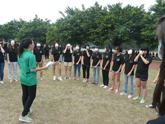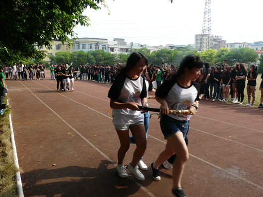 下午两点整,在各班班长的带领下,穿着各班独具特色班服的同学们准时来到目的地。此次趣味运动会分为呼啦圈接力、盲人方阵、n人n足和拔河四个环节。在主持人一声令下,本次活动正式开始。首先进行的是呼啦圈接力,起点和终点各分为4人一组的5个小组,由每个小组往返接力,用时最短的获胜。看似很简单的接力赛却一点也不容易,如果一个人抢跑就会导致后面的人摔跤,则要重新在起点开始。这靠的就是大家的团结,还要兼顾到队友。盲人方阵,都是在被蒙着眼睛的情况下,每个人拉着同一条绳子以默契进行,由一个圆形站成一个正方形。参赛选手充分相信身边的人,在“盲”之下挪步向前,最后都能够顺利完成比赛。活动在有条不紊地进行,他们的热情也在不断地膨胀。到了n人n足,有的班齐力迸发,有的班集体跌倒,但最终都是坚持走到终点,从不会放弃。最后的拔河比赛,是呐喊声最强的一个环节,紧紧的抓住那根粗粗的麻绳,不到最后一刻都不放手。他们的坚定让我们看到了朝气蓬勃、团结一心的精神风貌。