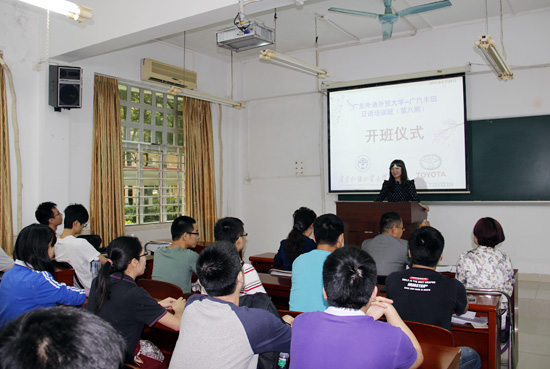 本网讯 4月24日下午,广东外语外贸大学继续教育(公开)学院与广汽丰田公司合作举行的第八期企业日语培训班在广外校本部第三教学楼120室举办开班仪式。广汽丰田有限公司人才培养中心科长闫亚鲁、人才培养中心刘璐璐女士、日语系主任刘小珊教授等出席了仪式。仪式由吴婉主持。