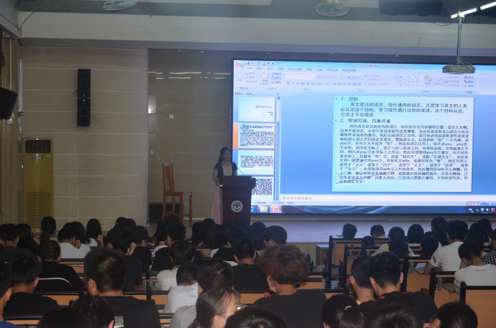王蓉老师为新生分享了语言学习的方法要领,并对同学们的在校四年的学习做了一个详细具体的规划,“学习现代通行活用的英语,认定好这个目标,方法才不会错误。”“语言四个方面听、说、读、写一起抓,要系统完整的学习。”“英语是‘活’的应用语言,说话和书写上尤为重视;但语言也具有差异性,需借助母语学会第二语言。”“注重效仿和诵读,背诵可以把语言的表达方式记住。”“在课堂上要积极踊跃地参加练习,不要害羞、要学会张开嘴,敢说、敢做。”“大一以听促说,听、说结合。大二,词汇为经,阅读为纬。大三,专业培训,考试比赛。大四,勤练写作,翻译资料。”王老师在讲座中引经据典,穿插了许多英语学习中的案例,同学们在轻松、愉悦的讲座氛围中既感受了语言学习的趣味,又直观地理解了老师要强调的问题和重点。