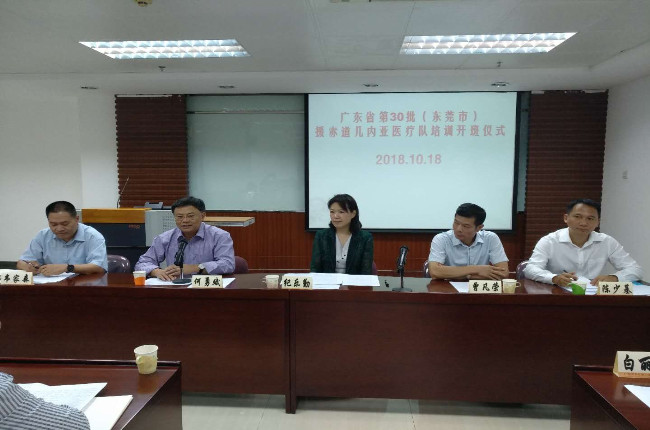 本网讯 10月18日下午3:00,广东省医疗对外服务中心第30批援赤道几内亚医疗队西班牙语培训班在仓边路举行了开班典礼。广东省卫生健康委交流合作处处长纪乐勤、省卫生医疗对外合作服务中心主任韦家森、东莞市卫生计生局副调研员曾凡荣、第30批援赤几医疗队队长陈少基以及我院院长何勇斌教授、团体开发中心主任吴敦龙、继续教育中心主任白丽云等出席了典礼现场,开班典礼由广东省医疗对外合作服务中心主任韦家森主持。