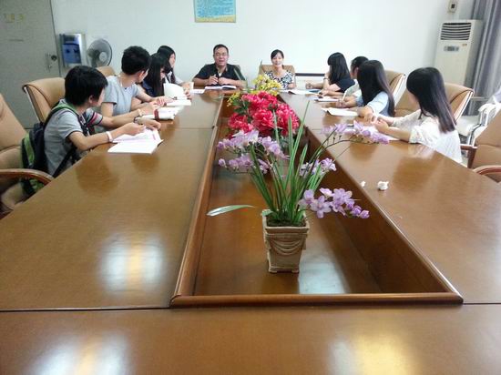 本网讯 为了形成合力,顺利完成国际商务系今年秋季的招生任务,2014年7月8日上午10点,国际商务系在晨学楼105室召开了招生助理培训会议。出席会议的有国际商务系主任杨妙新、副主任彭陟,去年的招生助理苏康燕及今年秋季的招生助理。