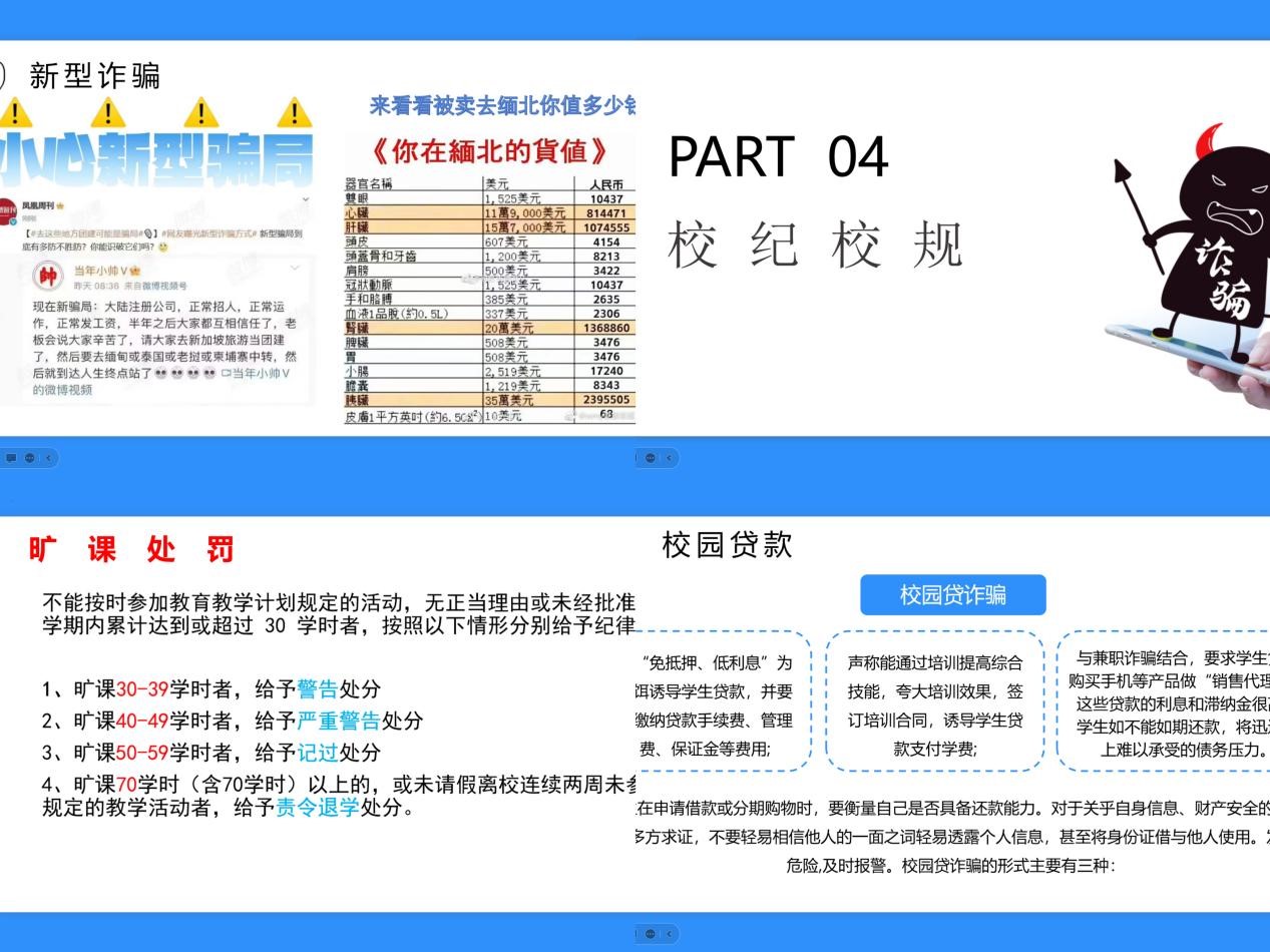 其次,随着信息技术的不断发展,各类诈骗手段层出不穷,防不胜防,其中以网络诈骗为主,通过分析“网络诈骗”典型案例来提醒各位同学一定提高警惕,时刻敲响警钟,不要相信不劳而获就能够收获成果,自己或身边同学遇到诈骗,要及时联系老师,避免被骗。
