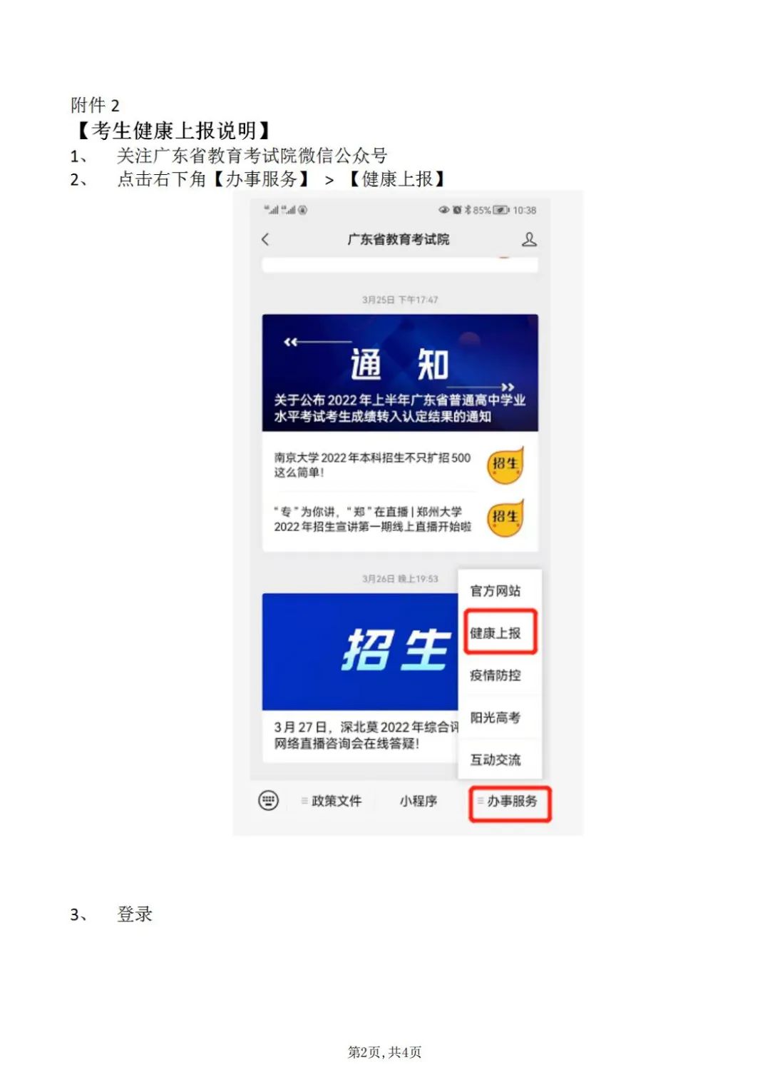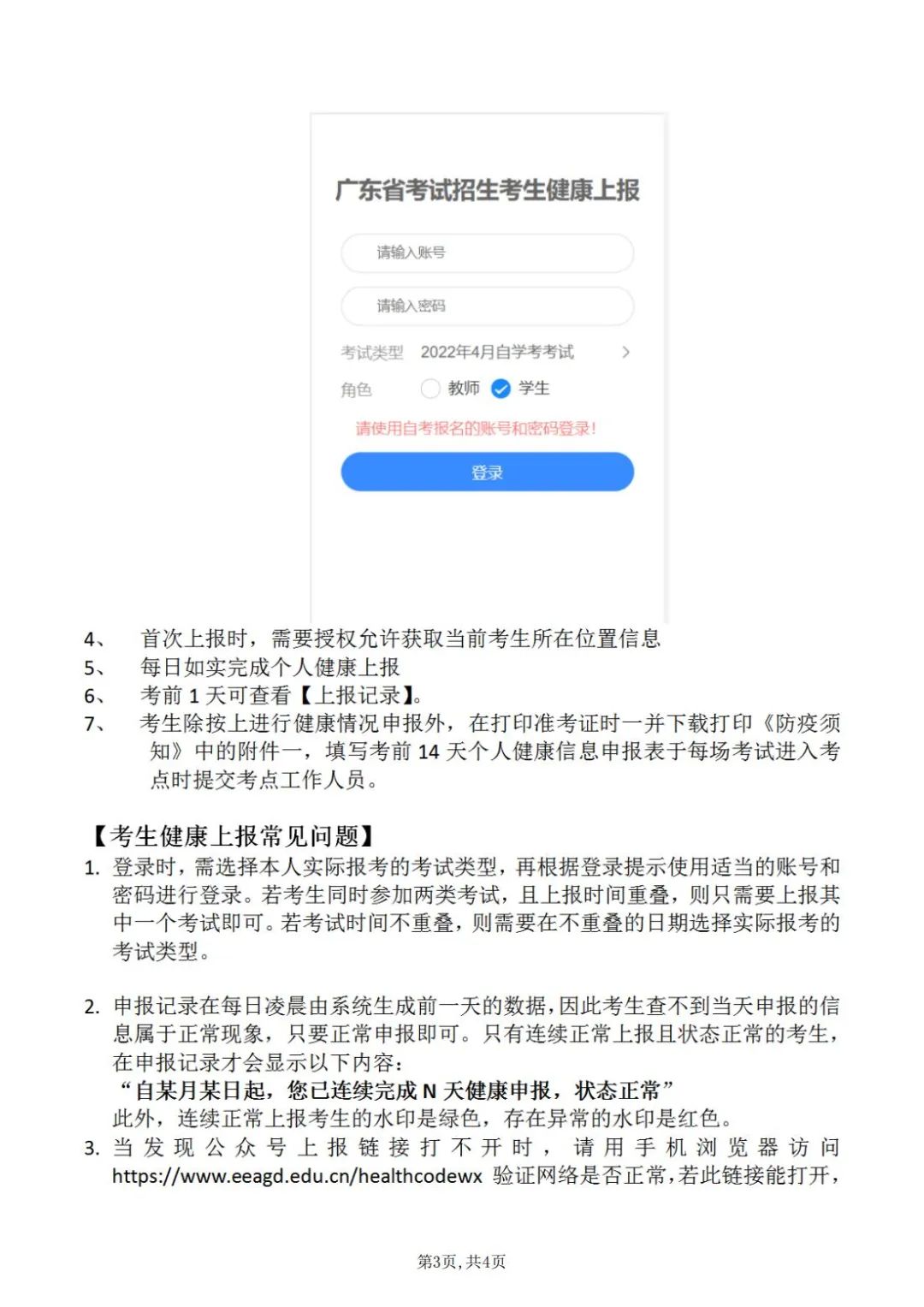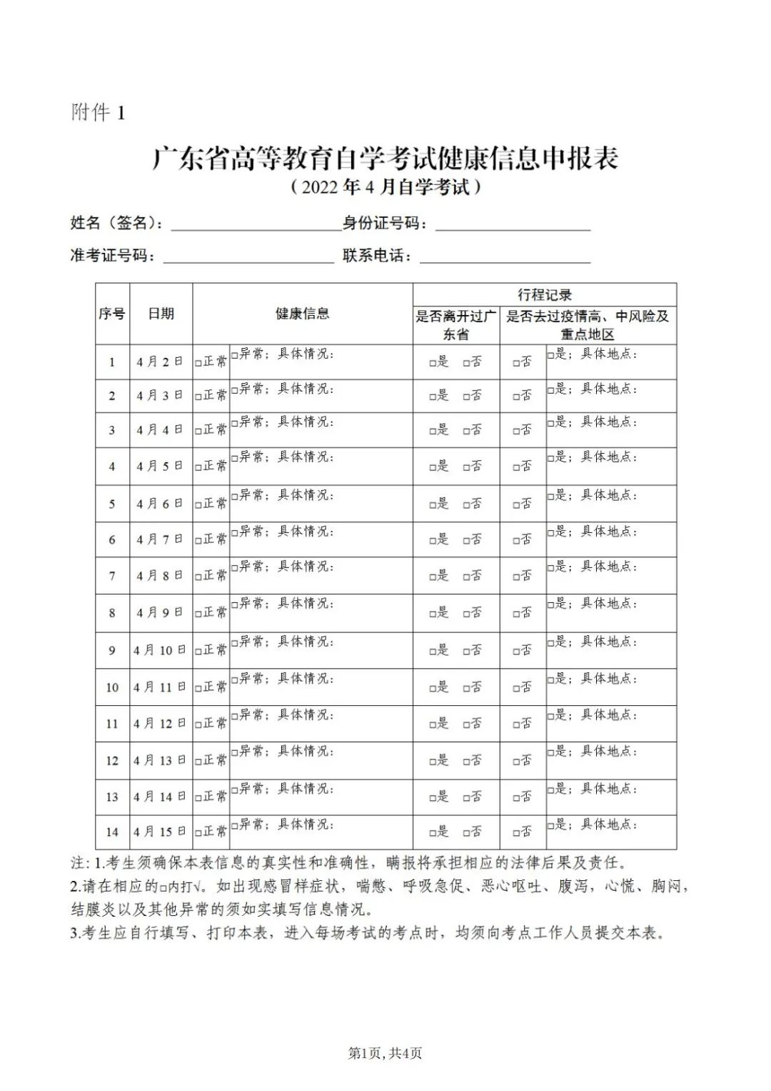 二、考生须进行考前14天自我健康观察,每日如实在广东省教育考试院官微中进行健康情况申报(申报说明见附件2),同时如实填写考前14天个人健康信息申报表(见附件1),并在参加每场考试时提交考点工作人员。